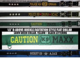 • If you’ll have lettering on a collar with a stripe and a badge, let us know the layout. i.e. “POLICE K9 (badge) TRIXIE”; “CHESTER PD (badge) K9 ZAP”; “K9 STUNNER (badge) CHP”; etc…